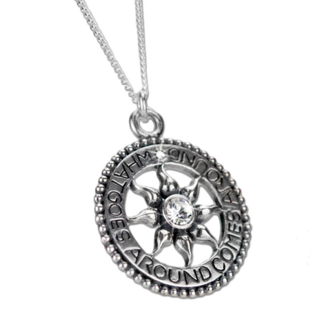 Anhänger 925 Sterling Silber, Motiv Sonne mit zwei weißen Kristallen, Durchmesser des Anhängers 25mm. Um die Sonne herum das Motto What goes around comes around . Auf deutsch entspricht das Was Du anderen Gutes tust, kommt irgendwann zu Dir zurück . Dazu bieten wir Ihnen eine 42cm lange filigrane Panzerkette, ebenfalls aus 925 Sterling Silber,mit Federringverschluss aus Silber an. Die Lieferung erfolgt in einer Geschenkbox.