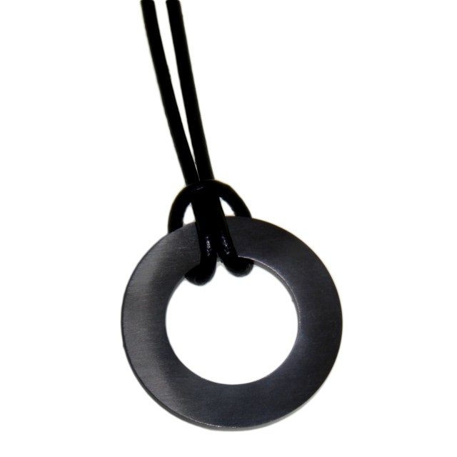 Runder Anhäner aus Edelstahl, rundum mit PVD dauerhaft geschwärzt. Durchmesser 30mm, der Artikel ist knapp 2mm stark, die mittige Aussparung hat einen Durchmesser von 18mm. Im Lieferumfang enthalten Lederband mit Karbinerverschluss, Länge 54cm, verkürzt sich durch die Schlinge um 4cm.