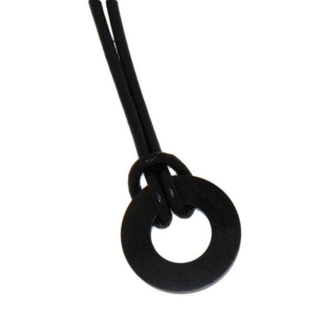 Runder Anhäner aus Edelstahl, komplett mit PVD geschwärzt. Durchmesser 20mm, der Artikel ist knapp 2mm stark, die mittige Aussparung hat einen Durchmesser von 10mm. Im Lieferumfang enthalten Lederband mit Karbinerverschluss, Länge 54cm, verkürzt sich durch die Schlinge um 3cm.