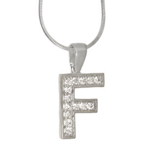 Anhänger aus 925 Sterling Silber mit dem Buchstaben F. Der Anhänger ist mit kleinen klaren Zirkonien besetzt. Oben an dem Anhänger befindet sich eine Öse für die Kette. Der Anhänger wird OHNE Kette geliefert. Die Lieferung erfolgt innerhalb eines Werktages und der Anhänger ist in einem Schmucksäckchen verpackt.