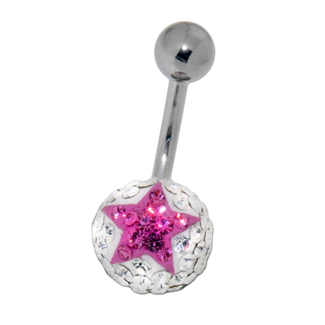 Bauchnabel Piercing aus einer Chirurgenstahl Stab und einer 10mm Kugel, die komplett rundherum mit kleinen Kristallen besetzt ist, dabei ist farblich ein Stern abgesetzt. Wir haben das Piercing in verschiedenen Farbkombinationen, Lieferung in n einem Schmuckbeutel. Der Stab ist in den Längen 8, 9, 10, 12 und 14mm erhältlich. Bitte vermerken Sie die gewünschte Länge in Ihrer Bestellung.