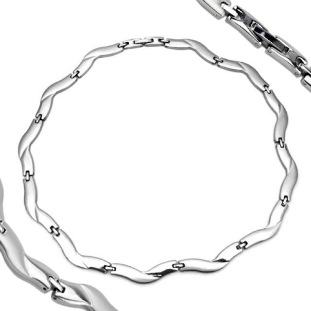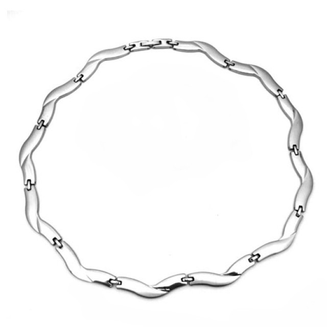 Collier aus Edelstahl, 42cm Länge, mit Klappverschluss, die Oberflächen sind im Wechsel glänzend poliert und mattiert bzw. gebürstet. Wir versenden den Artikel in einer Geschenkbox.