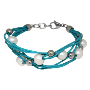 Lederarmband türkis mit weißen Süsswasserperlen und silbernen Kunstperlen