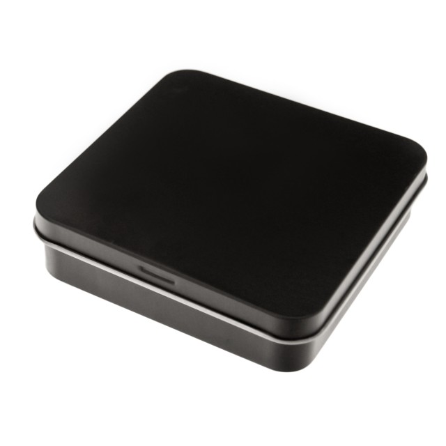 Schmuck-Box aus Metall, schwarz. Abmessungen 90x88 Millimeter, Höhe 20mm.