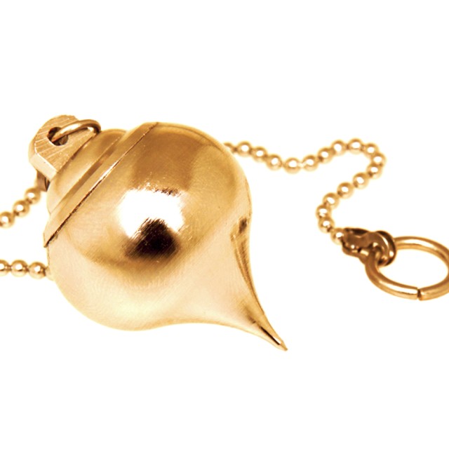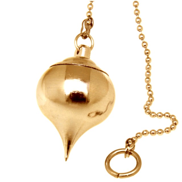 Pendel "Abbe Mermet" vergoldet, 40gr. das Pendel besteht aus vergoldetem Messing, ist ohne Öse ca. 35mm lang, die Kette hat eine Länge von 14,5cm. Wir liefern den Artikel in einem Velourbeutelchen (s. Abbildung). Eine Gebrauchsanweisung für das Pendel legen wir Ihnen bei.