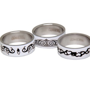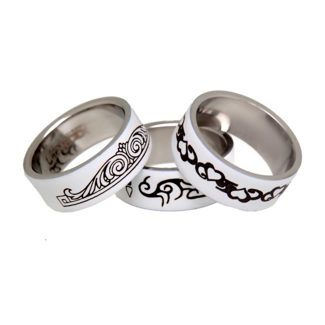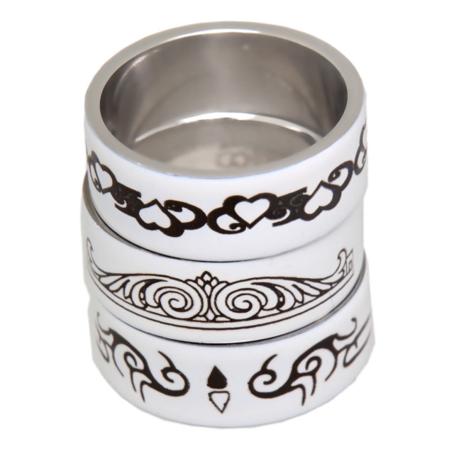 Stahlring mit weißer PVD-Beschichtung und einem gelasertem Tribal Design. Der Ring ist in 4 Größen erhältlich.