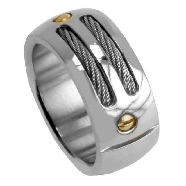 Fingerring aus 316L Chirurgenstahl mit zwei Drahtschienen und zwei PVD-vergoldeten Nietenköpfen. Der Ring ist in Größe53 lieferbar und kann gut mit den Armreifen STBC044 und STBC044B kombiniert werden.